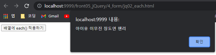 // 2) 배열에서 사용, each()가 배열안에 있는 데이터의 갯수만큼 호출