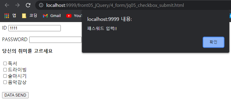 1. id, password 폼에 공란을 체크 -- 공백일때 alert 창 띄우고 포커스 맞추고, 페이지 넘어가지 않게 처리해준다.